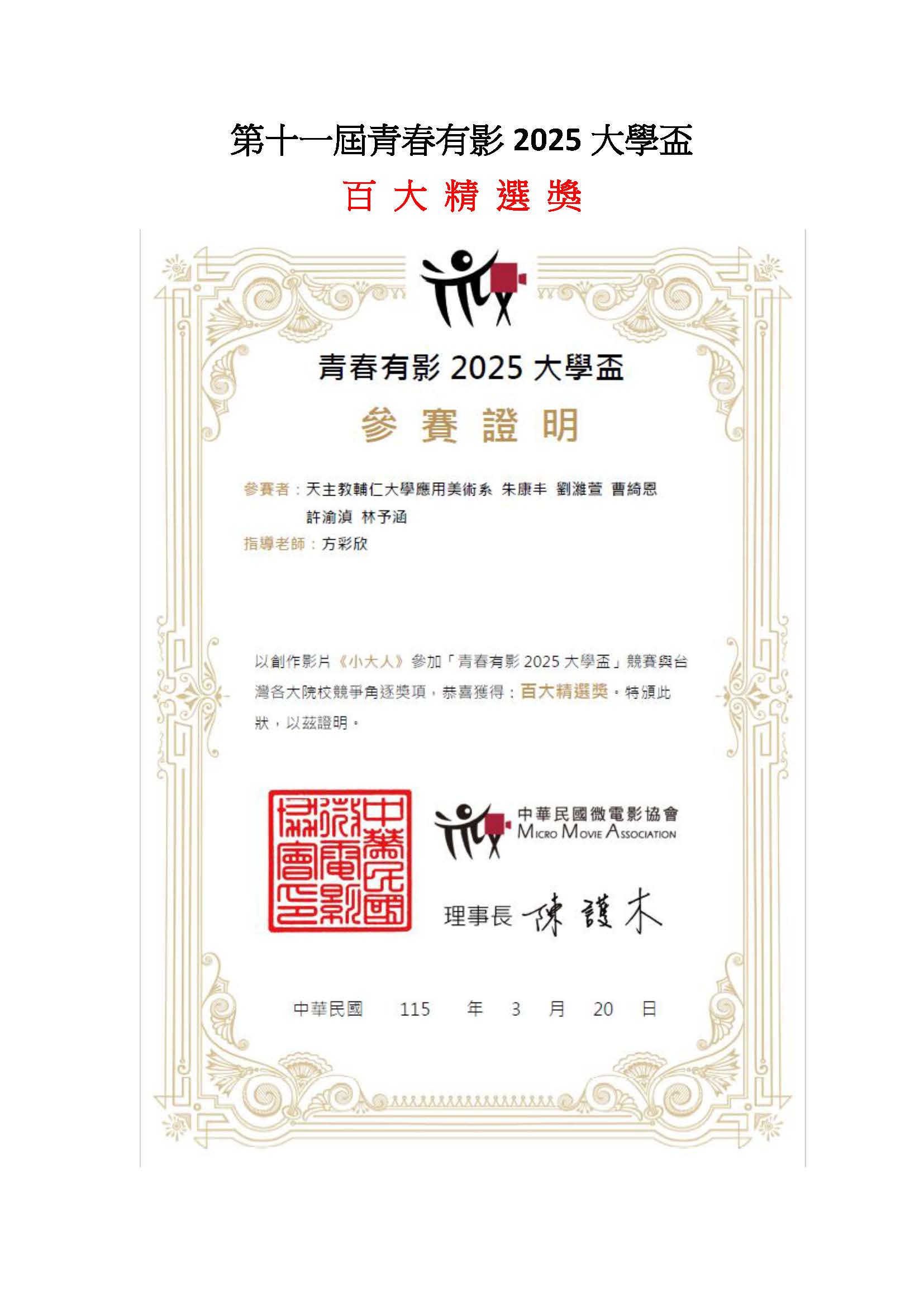 賀! 視傳組學生榮獲第十一屆青春有影2025大學盃百大精選獎